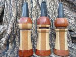 Second Photo: The mid portion of the barrel is composed of a light-colored Laminated Bamboo with a dark colored bamboo stripe. The end of the bell and the caps are Briar. Bamboo is very hard having the strength of oak. These calls produce a natural, warm sound. When ordering take your choice as the round caps are have varying portions of Briar. As you can see, these are strinking to say the least. $60.