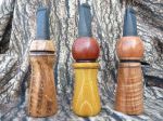 First Photo from Left to right: Call #1: It is made of Spalted Oak, a nice tan with black grain. Oak wood is very hard, heavy and sturdy wood. $45