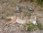 It went to the ground and then spun around and took off up the path that had carried it here, staying low. And I emptied my shotgun while it did. Quickly James and Matt displaced and moved to intercept from my left, James landing two loads on the back end of the departing yote. We found it a few yards up the swale and brought the contest to a quick close. 22 and a half pounds. Should have had heavier loads.