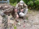 Within minutes, the TCP had abandoned that kill zone and quietly moved about 150 yards to another likely coon spot. Set up essentially the same way but in slightly more open hardwood bottoms with clearer vision lanes down low. Since I had just scored, I told the rest of the patrol that I would locate myself behind their gun line and watch their six again. I was crouched behind a two-foot tall sapling when the caller started spewing its dis directly behind me, minding my own business when, there straight ahead of me, the grass parts at the base of a large tree and this big coon comes galloping toward me! Just about the same set up as with the yote. First saw it at thirty yards but this animal is a) growling audibly - it's pissed off - and b) its heading right toward me and my little sapling! Gadet Bob is always getting me in these situations!! When it got to about ten yards, I needed to do something (What would ShaneDog do?!?!), so I stood up and leveled my long gun at it. That stopped the charge, it looked at me and I put the first load in its masked face, chest and shoulders, it rolled backwards and I used two more rounds to still the animal (Note to self: pack three or four rounds of heavier loads and ear protection on predator hides!) 12 and a half pounds. We tried to lure some inquisitive crows into the bottom, had a handful flash above the canopy and blew a few holes in said canopy but, alas, were unsuccessful. The Patrol then displaced to another part of the bottom and did down a couple crows.