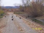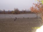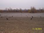 Yesterday I hunted public ground scouted by a friend. We had a great shoot although the steel shot was a pain in the ass!!! We killed 64 birds. A game Warden snuck up and checked us cause he thought we were hunting ducks out of season. He gave us some info where he had sighted some crows the day before. We checked it out and it was packed with em. We decided to leave them and do a predawn raid today and here are the results. Picture 1 and 2 are of the dried up barrow pit the birds were feeding in, taken from our hide. Picture 3 is of the road running along the same barrow pit, in the ditch by the road are thousands of dieng shad just boiling in the water. I realized this is what was bringing the birds in for an easy meal. The last pic is of our set in the afternoon that wasn't near as good due to rain all afternoon. We killed 84 in the morning hunt and 27 in the rainy afternoon. Good thing we were legal cause the game warden had some GOOD info. My TBC for the very young season is 392. I shot my Mxus with # 7 steel in the morn and a youth model 20 in the afternoon with #4 steel. My deeks were 6 carrylite feeders and 5 standard carrylites with four sentry's hung behind the hide. Calls were come here crow from a 512 red rock (thanks Jessie) and my CS-24 fox pro screaming crows, and Dying crow on approach. The combination of the two calls are deadly. I also had a 3-d flapper from urea duck and my trusty jack kite flyin in the wind. My buddy was shooting a Browning B-80 with a turkey choke and #6 steel. Lessons learned #6 steel is better than #7 steel and if you find a big concentration of birds staging late in the afternoon it is better to hit them the next morning at daylight if possible.