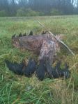 Went out to a friend’s farm the other day because he said he was having some issues with fox and his chickens. Saw a small family group of crows nearby as I drove up to the property, I couldn’t help myself and I grabbed the decoy bag out of the truck and walked in. I set up a small spread and posted up under a tree, clicked on the foxpro and within 10 minutes had five down. On a whim, I collected the decoys and left buster on the ground flapping away. Turned on the ole’ titmouse tantrum on the foxpro and guess who showed up in less than 2 minutes into calling. The fox actually came up and put his noise on buster before moving off away from me, I took the shot and hit him a little far back, he took a few steps over the bank and I moved in quick for the follow up shot, that’s when I discovered the BONE YARD, I didn’t even know it was there. I am willing to bet there are a few more fox out there now..