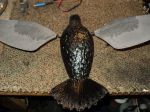 Here's one of my modified Dove decoys. The wings are not that gray. The camera has amplified the actual color. But, you can use some spray adheivsive and use some black plastic trash bag to make the wntire wing glo0ss black. However, the Crows don't seem to care from my experience with these modifieds decoys. Just be sure to stock up on AAA batteries.