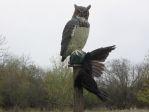 The icing on the decoy cake is the mortally wounded crow in the talons of the pesky owl. Again, see M12's images. In-bound crows viewing that scene and listening to an owl-crow fight call will be focused on that display usually to their detriment. I use an $8Halloween bat with flapping wings for that victim role and it works well.