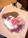 I took a can of foaming insulation, some red, black, and blue spray paint, and some fake fur from craft store. When you spray one color over the top of each in layers it looks great. Got the idea on the web, Game! Here are a couple more...