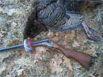 I picked him up yesterday morning at 4:30 ad we were sitting under a tree on the edge of a hay field by 4:50.  Legal light was 4:59.  I set up a feeding hen decoy 20 yards in front of us and set my Foxpro on the ground under the decoy.  At 5am I turned the call to hen clucks.  A turkey gobbled way across the field and in the woods at our "1 o'clock."  I would hit the caller, he would gobble every 2 minutes or so. Every time that he gobbled we could tell he was getting closer. About 5:15 he appeared on the edge of the field. He hung around there a few minutes. I hit the caller again and he started running toward the decoy. He ran about 200 yards to get to us. He stopped at 30 yards and Dad shot him with one of my old Nitro Special double 12's. This gun is 11 years older than Dad.biggrin  One shot to the head dropped him. To make it more special for me, he used one of my reloads. Low brass 2 and 3/4" cartridge, 1 and 1/8 ounce of #5 shot. Having the Foxpro right with the decoy and away from us really helped to cover our movements.