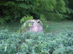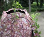 Picked up a couple more today. Another perfect morning BTW. I was situated beneath the edge of the overhang from some huge walnut and maple trees. I like it when they land about 15' away. Also, the roofless doghouse is looking better with more foliage and it withstands the weight better because I pinned the corners down. I will keep adding more to it as the days go by to see how much it will take. I think it needs a bit more. Otherwise, I think this setup works just fine.