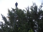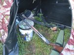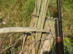 In preparation for this, the 2nd MI half-season (BH may disagree, but he's usually right), I thought often of the easy/speedy/lightweight blind problem, while reading of others’ solutions on this Forum. I've been thinking about my older, beat up doghouse blind with lots of roof holes, and often wondered what would happen if I simply cut the roof out. So yesterday, I did. Also added extra ties at the corners and top of each peak. Light, easy/fast to set up and works really well! It’s a little flimsy without the roof fabric to add support, but I will continue the experiment. Also, the first time use of the spinner seat atop the 5-gal bucket worked perfectly--best $10.00 my wife spent on me for Christmas! I added a carrying strap to the bucket in place of the handle. I acquired a 40' hotstick a few days before the first 2013 half-season ended and I got around to camo painting it last weekend. Looks a lot better now with the sentinel crow up there than with the florescent yellow paint job it had previously.