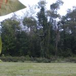 Today’s report contains several success stories. Following this, the fourth outing this season, I’m pretty sure that the two “home-modified” pieces of equipment new to this season have proven successful. (1) The doghouse blind with the roof cut out is the easiest blind that I’ve found to set up (and cheapest). I recommend it highly for low-to-moderate wind conditions. There’s a photo here of the sky, looking up from inside, about seat level. (2) “Crow on a Stick” works well with the low bushes like soybeans and smaller blueberry bushes. We have lots of fields of each around here. Thanks to Ted’s advice, I am now a believer in getting away from the tree lines and in the middle of the fields so the bandits cannot hide in the trees above, behind, and beyond. It’s not always possible to do this, but it will be my default position for the coming weeks. I had a problem today in that I could not find a suitable location to place my 40 foot “hotstick” with the sentinel crow on top such that it was silhouetted against the sky like the red tail hawk is in his photo. Also, I need more foliage tied to the blind to complete the camouflage, but that has been getting better each time.