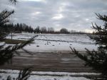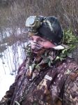 A fine morning, just above freezing and cloudy with a little bit of wind—too much to use silhouettes in the little tree. I hid within a group of 20 foot pines, not using a blind. Set my hotstick sentinel at the top of a small tree, off to my right about 40 yards with eight decoys spread to my front, across the road from me, surrounding another small tree in where I had placed my Spitfire and the owl decoy.