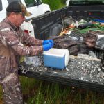Yes, we do "field" clean them.. We carry some jugs of water and soak them in a cooler filled ~1/2 way with water.. gets some of the blood out and most feathers off... then a 1 mile drive for final cleaning to be refrigerated or frozen... here's 68 we picked up on Tuesday afternoon... We have a wire ~110 yds strung across the 3 acre field .. This morning a Red Tail Hawk came in and hit one of the decoys we had on the wire.. I didn't actually see it as I was retrieving a down bird....My cousin told me about it...
