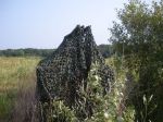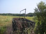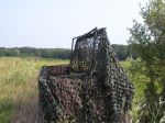 The release mechanism is a simple piece of copper wire wrapped around one or both sides with a piece of 550 cord as the “ripcord.” It works very well. I suppose that if I wanted to, I could restrict the opening’s fall with ties, to make a smaller opening. Also, if I wanted a strictly seated blind, then the only thing needed would be to make the side uprights shorter or make a second set; one for standing, one for sitting.