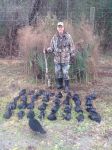 Exactly five weeks after shooting the high-fence dove field where we shot 128 crows, Pete & I returned to see what we could do.  We had planned to shoot yesterday, but the fog spooked us and we reset for today.  We set up in a different place and got in the blind early.  It was cold and breezy.  The 39 degree weather sure seemed colder with the 10 mph wind driving it through our jackets.  To make matters worse, we have had several soaking rains lately to the point where we had to pick a spot closer to the blind than normal to set out our decoys.  One bird I knocked down died from drowning before the lead shot finished him off as he landed in the deep end of a nearby mud puddle! biggrin