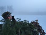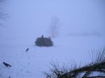 Oh yeah, the crows. Almost forgot. They were sounding off 360 degrees around us, right on time, about 15 minutes prior to sunrise. We couldn’t see much except directly above us was almost visible blue sky. As it lightened it was as if we were wrapped in cotton from the ground up. Visibility was about 30-40 yards with zero wind. This permitted the crows that did move in from all directions in response to BH’s large and loud caller, to remain unseen, until they were almost upon us. This did not happen often. I managed to nail two. One spiraled down nicely, bouncing from the crater he made through the icy crust, with a lot of red splatter (photo 2). A second one, when hit, went “landing gear down” according to BH. I thought I had missed and took a second shot. I lost him but BH saw where he landed about 80 yards distant. He sat there for about 30 minutes and escaped. We talked about what had happened and agreed that the set-up/camouflage was good (I’d say excellent), but the thick fog and zero wind were big hindrances to, in BH’s estimation, what shouda/coulda been a 20-bird morning. Photos include BH doing set up (Photo 3); in his blind (photo 4), me in my blind trying to make crow noises (photo 5). Lots of lessons (re)learned today. Back into the blindfold and back to our respective Counties. Thanks BH! And thanks to all of you for reading this (mostly) tall tale!