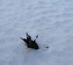 Well, I made a lengthy posting last Wednesday about my hunt as Big Honkers’s guest. It was 15 degrees colder, very deep snow, with a crust on top which made our getting about the set-up a good bit of exercise. Please note photo #1 where the bandit I shot hit the ground hard, making a small crater in the crust, bouncing a couple of feet to the left. Photo #2 from this morning is proof of how much the snow has softened since then, as this bandit went down headfirst like an arrow, ending up looking rather like a duck in the shallows grubbing around for food*. Gentlemen, this is indisputable confirmation that the snow is softer today and without a crust. Therefore, it is warmer and spring is here. Case closed.