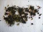 Opening day +1 (today) was different. Set up (photo 5) at the usual early hour before sunrise and settled in, making “happy” turkey sounds with my pot caller and scanning a 180 degree field of fire. Nothing. 7:30, 8:00, 8:30, sunny and warm. But wait…off to the extreme right, about 150 yards to the west, I saw three come from the wood line and stop to feed at the NW corner of the blueberry field (photo 6). OK, more happy sounds. With that, their heads shot straight up and looked my direction toward the four decoys. Then back to feeding. In another minute, 8 more showed up; a mixture of jakes and hens led by three good-sized jakes. All eleven meandered their way toward me (photos 7, 8, 9) which gave me the chance to take a few photos. At about 40 yards, I had to put the camera down and get into my chair slouch with the shotgun. The three jakes came to my side of the decoys at 20 yards and circled the two decoys until one jake broke away from the cluster and was clear of the hens behind him and bang! (photo 10) The rest took off or ran toward their start point. He weighed just under 18 pounds with a six-inch beard and ¾ inch spurs (photo 11) and now resides in a very cold place in our garage, waiting for an invitation to Thanksgiving dinner. I always open up the crop to see what they have been eating (last photo) and this one had been enjoying blueberries--one reason why this farmer/landowner is fond of turkey hunters.