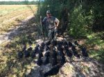 As mentioned above, 9:30 was the abrupt end to our hunt. Don't know if was the location or the warm weather, but after 9:30 we couldn't hear, see or shoot anything resembling a crow, so we packed up and left. The final count was exactly 50 birds downed. Yes the picture only shows 36 crows but there are reasons for this: A deep ditch behind the blind, chiggers, ticks, rattlesnakes and the heat. BTW, those are the same reasons that a lot of transplanted Northerners don't stay around here for very long.
