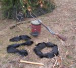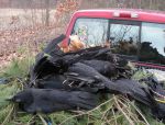 Then today--#4. Went to a pal’s “back yard” (nearby home handy for emergency bathroom break) which consisted of cornfields to the north and west, woods to the east, and unkempt vineyard rows behind us to the south. Set up the night prior (more luxury) and by “opening bell” this morning, was the best setup ever. The place erupted in crows at “first call” and it was delicious chaos for a few minutes and settled down to action every 5-15 minutes or so. 20 bandits went down in flames with a few missing in action, going down a good distance from us in the woodlines or funky vineyard to our rear. Buffy Bat performed superbly, but the necessary experiment in, “Just how long will the 2XAA batteries last in this thing?” resulted in it proving good for only one full day’s hunt, i.e., 2 fresh batteries each day to keep him flapping for at least 3 hours. I like him a lot and will write a short post on his adaptation from Halloween toy to serious CrowBuster killing machine! Photos 15-19.It's good to get caught up with my reports.