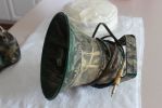 Final photo shows the Spitfire hanging beneath the "owl pole" with the 10' cable from it to the amp, inside the blind. The two speakers are the usual 50' distant.
