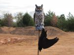 Went out this morning and had a fighting setup. 2 Crow, Fish fighting over a crumpled up red bandana with 6 others looking on. Things were really slow. All of a sudden, a Coopers Hawk swoops in and snatches one of the decoys and flies away!!! Not realizing that it was a cardboard silhouette! Well, it gets about 25 yrds and tries to take a bite out of it! Oops! Immediately drops it, and lands, dejected in a pine. Walked to where it was, picked it up, then took the other Crow, Fish up and sent in Hootie! Hootie was not impressed!