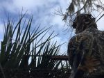Our decoy spread (swimming in mud), blind, sentry decoys (halfway up the tree) and a dead crow sentry bird at treetop level.