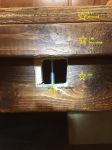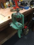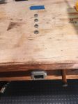 I had to select a location to remove a square chunk of 2X4 wood to pass the receiver through. As you can see from photo one, my calibrated eyes did not exactly work properly and I had to chisel a bit more away on left side. On the second photo, you can see the four 3/8” X 4 1/2” cap screws I used. Bolt #1 went through the 2X6 and the other three went through a chunk of 2X6 spacer right behind the bench’s 2X6. Photo #3 shows the press mounted and photo #4 shows it removed. I countersunk the bolt holes using a spade bit and touched them up with a fine chisel in order to get the upper socket in. I used nylock nuts beneath, each with a washer. This setup is quite sturdy and there is no wiggle when the press arm moves through its cycle. Any questions, PM me.