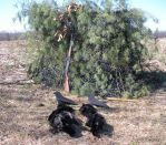 Reconned a favorite spot yesterday, a week following the rains, and was pleased to find it passable, unlike the mire it was a few days ago. So, I set the blind up last night to save some time. This place is in a large, open cornfield, about 6 miles E of town on a main road. While setting up the blind yesterday afternoon, it was quite windy (15-20 mph) and I wondered if it would be there the next morning (it was). BUT, off in the distance in this large field, a group of 50-70 bandits were feeding; changing positions periodically. They continued for the hour I spent setting up. So, I was hoping that they were intending to be temporary residents on the tree line to the south. I informed my friend, Larry (The Master Machinist), that we had a good chance to once again see his creations at work in the morning. He agreed to meet me at the usual time—well before dawn. Setup photos do not show all decoys, as many are difficult to see among the corn stalks. I had 10 silhouettes hanging in the tree along with the sentinel on the hot stick. Oh yes, we had to walk a whole 250 yards to the trucks—not like last week where it was only 50 feet away.